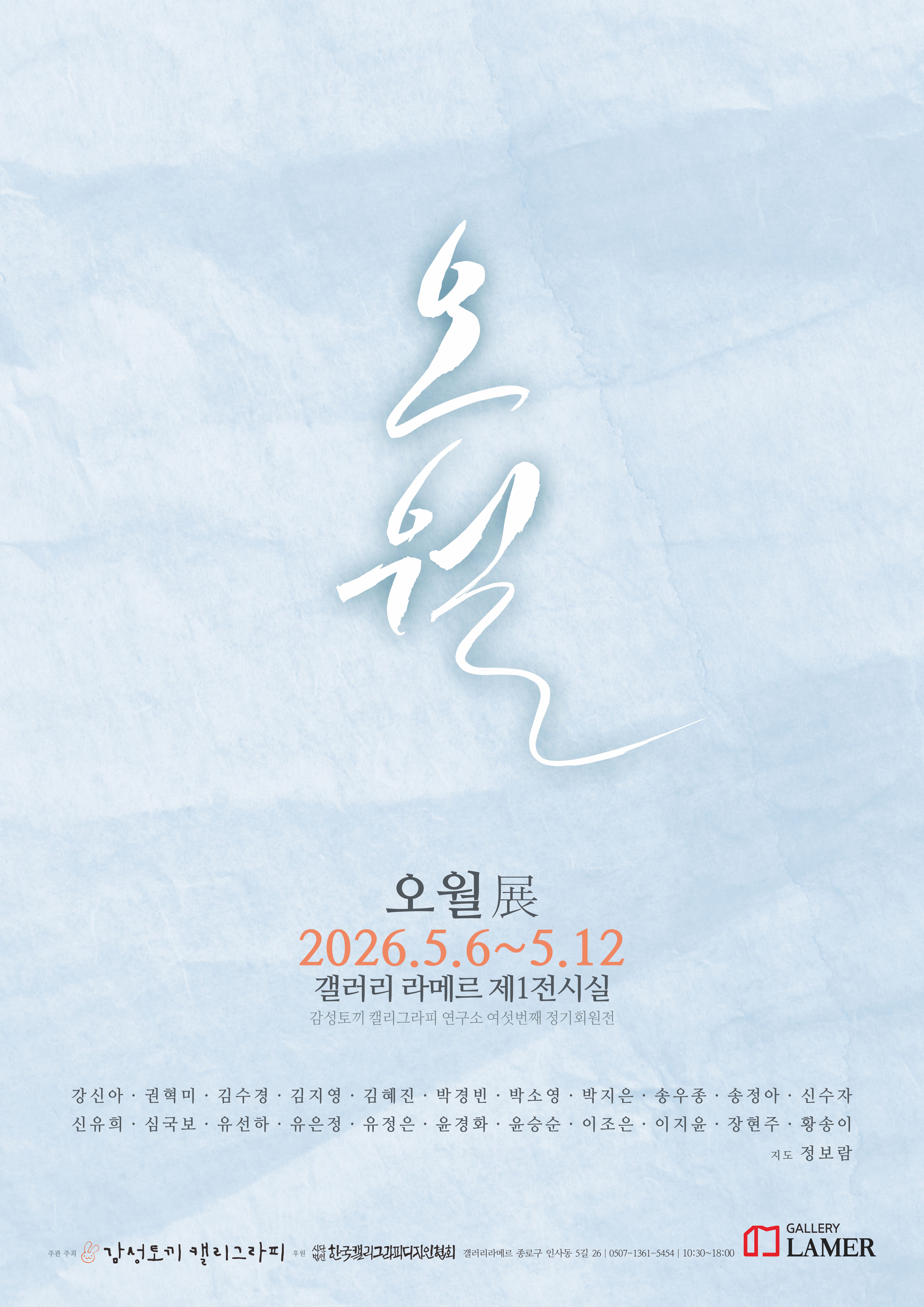 - 일정: 2026. 5. 6.(수)~2026. 5. 12.(화) 오전 - 장소: 갤러리 라메르 제1전시실 - 주최: 감성토끼 캘리그라피 연구소 - 주관: 감성토끼 캘리그라피 연구소 - 후원: (사)한국캘리그라피디자인협회